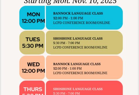 The LCPD offer Shoshone language and culture classes to the general (tribal) public on Monday thru Friday from 12:00 to 1:30 pm daily and Bannock Class from 1:30 pm to 3:30 pm, and on Monday & Wednesday Bannock Class from 5:30 pm to 8:00 pm. At the Language and Culture Preservation Department conference room.